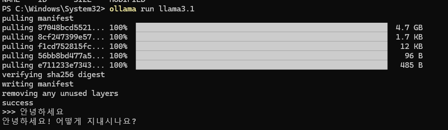 자 이제 라마 모델이 설치 되었다. 잘 설치 되었는지 확인하려면