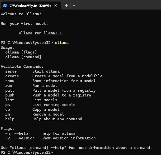 설치 끝나면 아래 같이 cmd 창에 설치 완료 글이 뜨고 ollama 를 입력하면 사용 가능한 명령어가 뜸. 이렇게 나오면 설치는 끝난거임.
