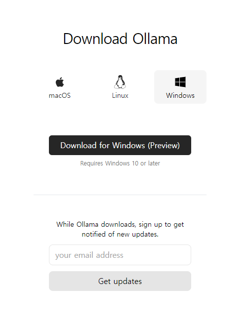 올라마 홈페이지 https://ollama.com/ 에 접속해서 본인 PC 환경에 맞춰 설치하면 됨