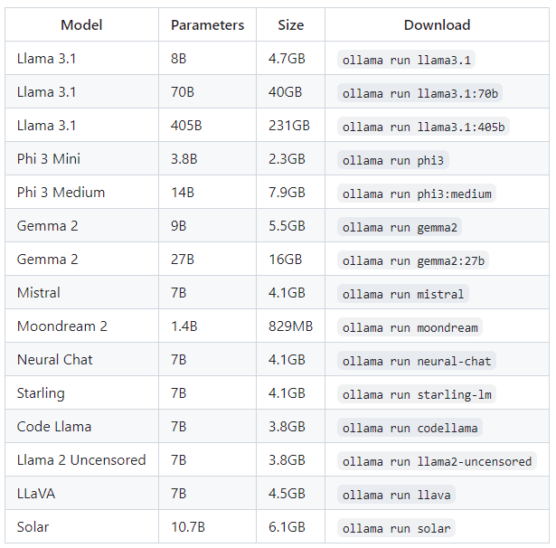 https://github.com/ollama/ollama 올라마 깃 페이지에 가면 실행 방법이 자세히 써 있다.
