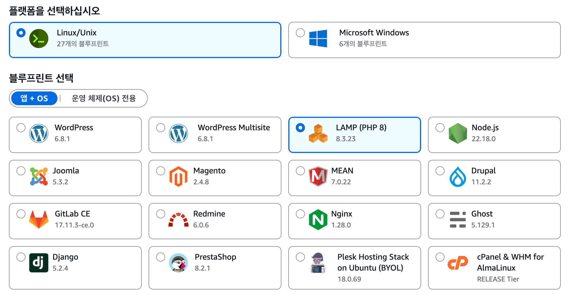 Lightsail 은 저렴한 서비스는 3개월 무료로 사용할 수 있다. APM 서버 자체가 가볍기 때문에 최저 사양으로 사용하기로 결정했다. 앱인 설치된 것도 할 수 있지만, Apache, PHP, MySQL 모두 직접 설치해보고 설치과정에서 발견할 수 있는 취약점이 있지 않을까 해서 직접 설치하기로 결정했다. 참고로 LAMP 는 SSL 자동구성, Linux, Apache, PHP, MariaDB 가 설치되어 있고, phpMyAdmin, PHP 기본 모듈이 포함 되어 있다고 한다. (편하게 하려면 이거 설치하는게 좋을듯 합니다.)